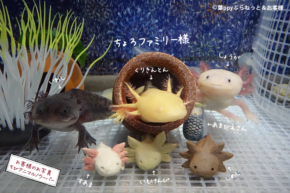 いわしさん、くりきんとんさん、しょうがさんでなるウーパーちゃんご家族!